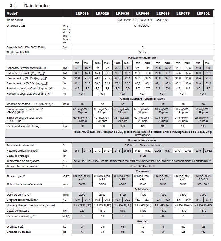 Puterea termica nominala a generatoarelor variaza de la 5 la 97 kW.