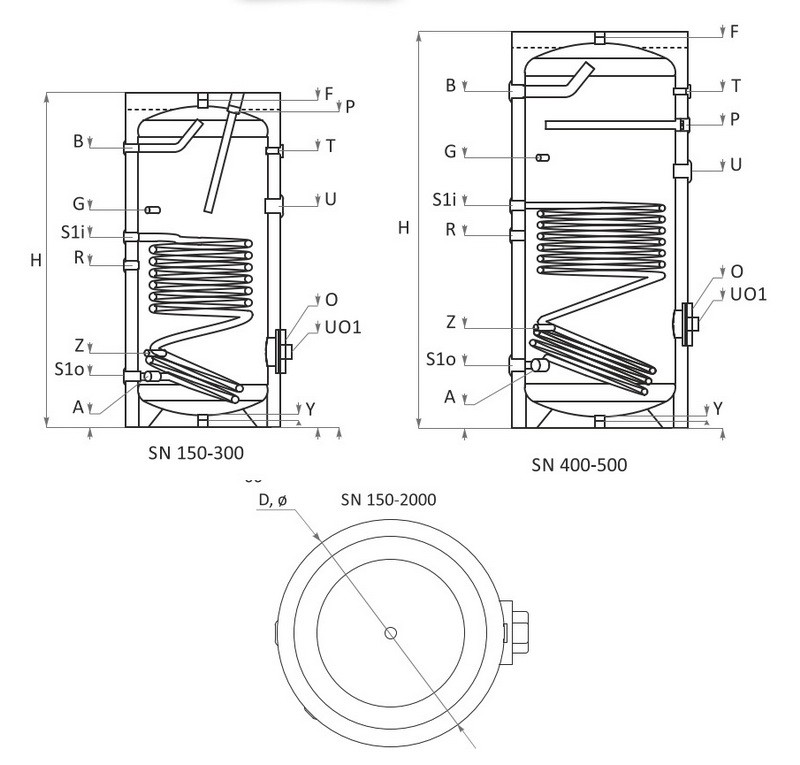 Boiler cu o serpentina Sunsystem SN - DIMENSIUNI SI DATE TEHNICE