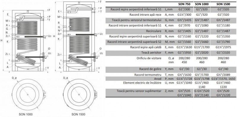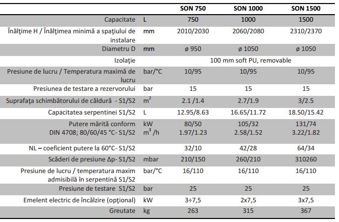 Tabel date tehnice boiler de sol cu dubla serpentina SUNSYSTEM SON 750 - 750 litri
