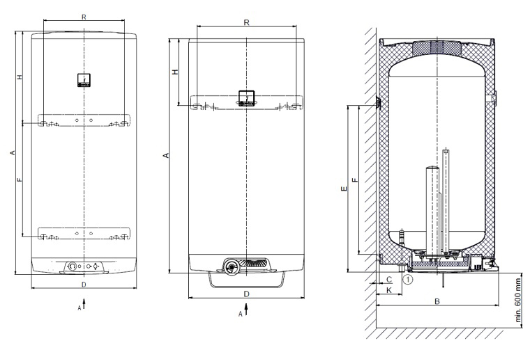 In partea superioara este amplasat termometrul, care indica temperatura apei din boiler. Corpul boilerului este izolat cu un strat de poliuretan, care garanteaza pierderi minime pentru caldura. Instalatia electrica este amplasata in partea inferioara a incalzitorului, sub o carcasa de protectie.