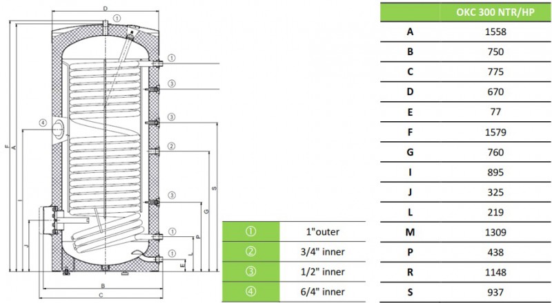 Boiler indirect cu o serpentina marita ( 3.2 m² ) pentru pompe de caldura Drazice OKC 300 NTR/HP 300 litri - dimensiuni