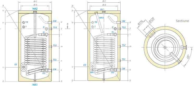 Boiler indirect cu o serpentina marita ( 3 m² ) pentru pompe de caldura TESY EV 2x15 S 300 65 HP - 300 litri - caracteristice tehnice