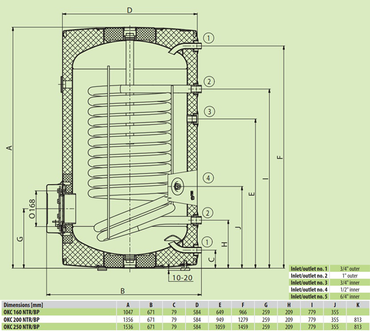 Boiler indirect cu serpentina Drazice OKC 160 NTR/BP - dimensiuni