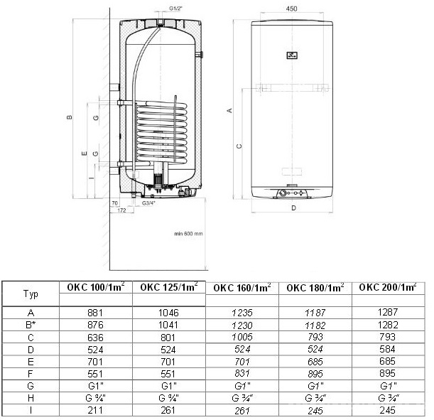 Boiler termoelectric cu serpentina extinsa DRAZICE OKC 200/1m² - dimensiuni