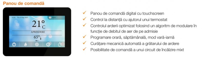 - Eficienta energetica: controlul arderii optimizat printr-un algoritm de modulare care ajusteaza dozarea peletilor si a aerului pe masura ce cazanul se apropie de temperatura setata, reducand consumul si sporind eficienta.