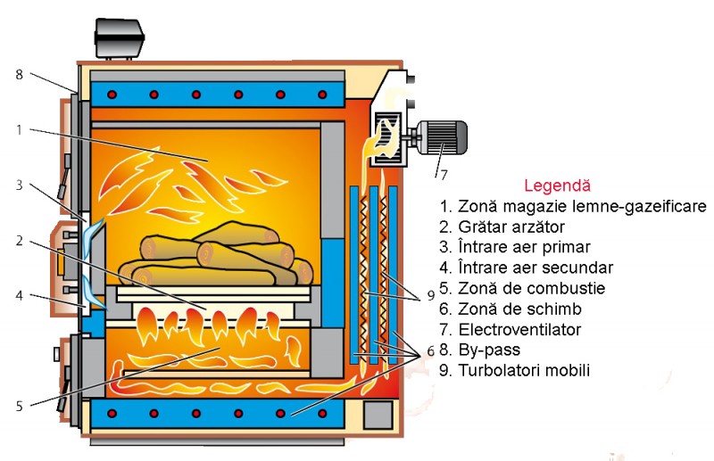 Combustibilul solid,asezat in locasul superior al cazanului (magazie lemne), in contact cu jarul produs pe gratar, da nastere la gaze care, combinandu-se cu aerul comburant (aerul primar) creeaza un amestec combustibil. Acest amestec este aspirat prin fantele gratarului, in zona inferioara a focarului (zona de schimb), unde va da nastere asa-numitei „flacari rasturnate”.