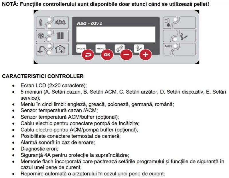 Lemnul sau brichetele se incarca manual, iar arderea este controlata prin termoregulatorul (termostatul cu lant) care actioneaza clapeta de aer de pe usa centralei.