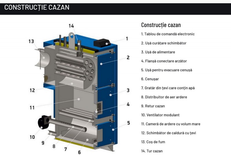 Cazanul este echipat cu trei usi: usa de sus pentru curatare schimbator de caldura, usa de mijloc pentru incarcare combustibil si usa de jos pentru indepartare cenusa.