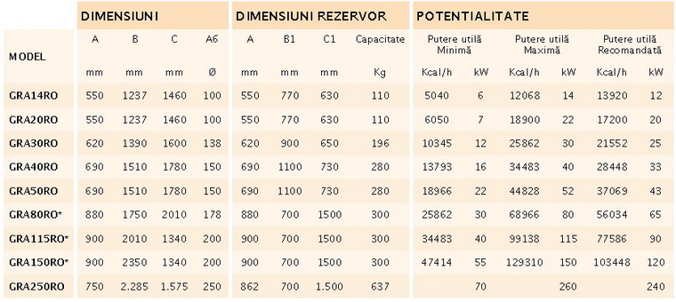 Dimensiuni Centrala termica pe peleti ARCA GRANOLA AUTOMATIC GRA 150 RO