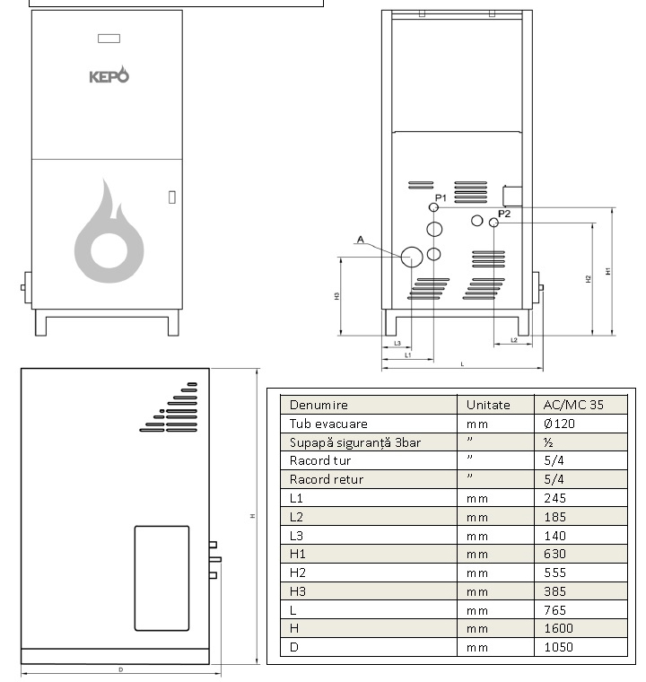 Dimensiuni Centrala termica pe peleti compacta KEPO 35 CM - 35 kW