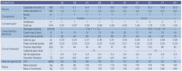Caracteristici chillere Clint CHA/CLK 81 - 20,5 kW – racire