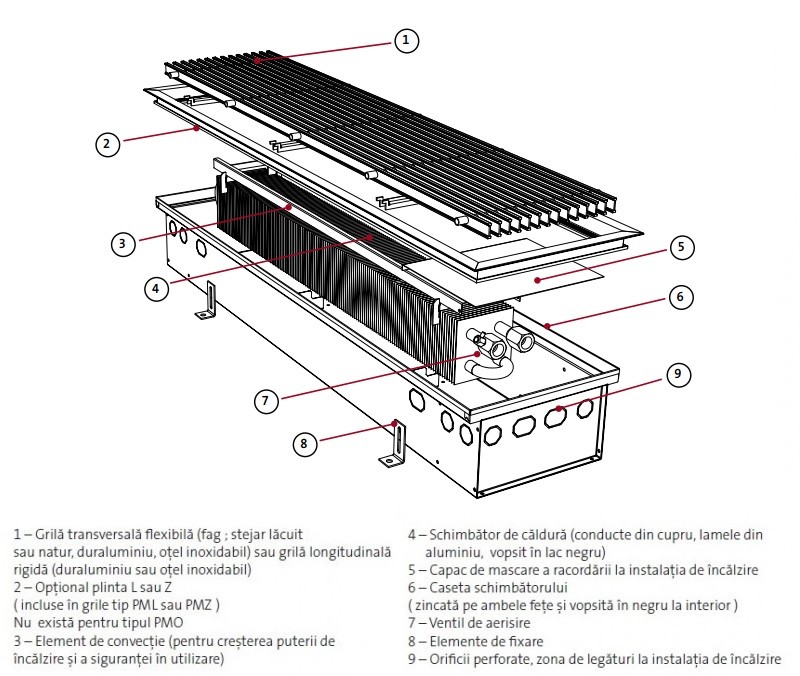 • Elementele casetei: șuruburi reglaj nivel M8x30 mm cu cap hexagonal interior (pentru lungimea casetei până la 2,5 m – 4 buc., peste 2,5 m – 6 buc.), 4 cleme de fixare pe casetă, legături pentru racordarea la instalaţia de încălzire centrală + 2 legături pentru racordarea la instalaţia electrică, capac din tablă zincată care maschează racordurile convectorului, un panou multistratificat care protejează convectorul și racordurile împotriva avarierii sau murdăririi în timpul montajului.