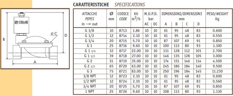 Electroventilele de apa normal deschis CEME ESM8713 - 3/8" sunt destinate a fi utilizate in aplicatii domestice, comerciale sau industriale în conformitate cu specificaţiile tehnice. Forma constructiva este „servocomandată” – bobina nu actioneaza direct asupra membranei ci prin intermediul uni tevi de impuls din amonte ceea ce asigurt o presiune de închidere marita dar necesita un minimum de presiune la intrare de 0,3 bar pentru operare. Ventile electromagnetice cu racorduri filetate, pentru aplicaţii generale, pentru sarcină continuă (ED100%), Versiune „normal deschis” (deschis fără tensiune).