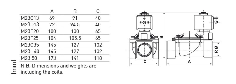Electroventil de apa normal inchis Fantini Cosmi M23 - dimensiuni