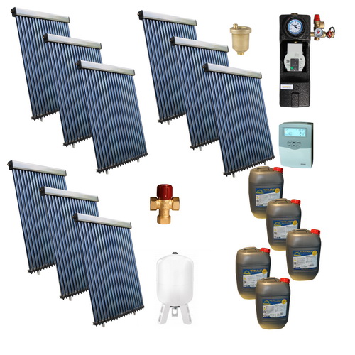 Sistem solar pentru apa calda menajera, fara boiler, destinat pensiunilor/hotelurilor cu 30 persoane. Echipat cu 180 tuburi vidate (9 x CS20).