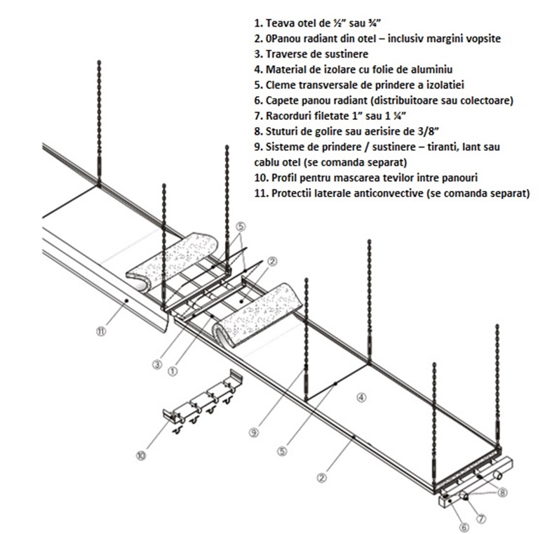 La partea de sus, panoul radiant modular ECOPAN este completat cu brate transversale pentru a fixa sistemul.