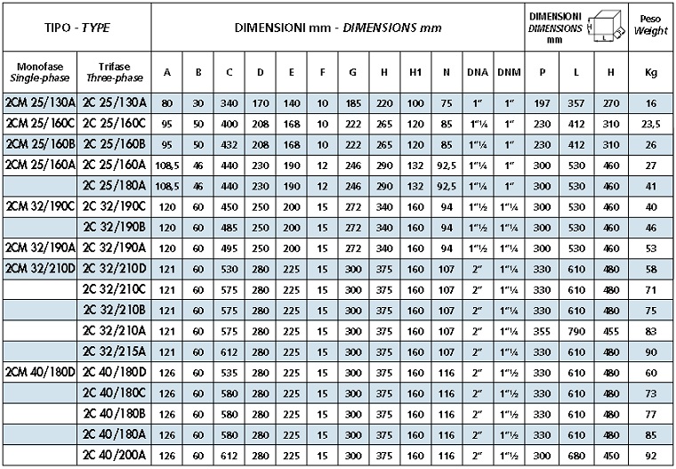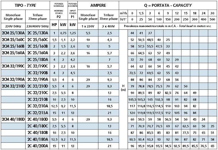 TABEL Pompa centrifuga SPERONI 2C 25/180A - 72 mCA: