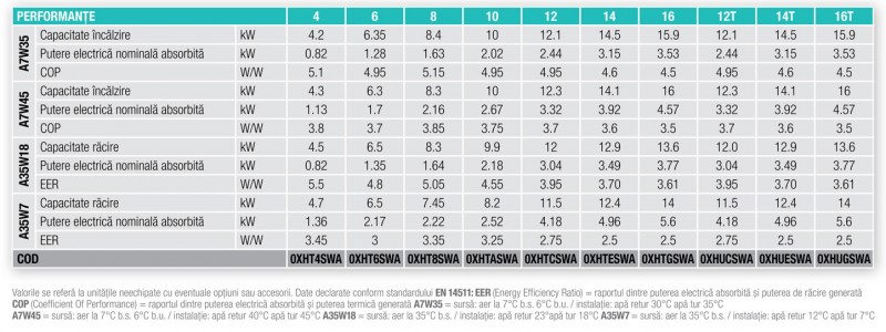 * SWL = Niveluri de putere acustica, raportate la 1x10-12 W cu unitatea in functiune in urmatoarele conditii: A7W35 = sursa: aer la 7°C b.s. 6°C b.u. / instalatie: apa retur 30°C apa tur 35°C. A35W18 = sursa: aer la 35°C b.s. / instalatie: apa retur 23°C apa tur 18°C Nivelul de putere acustica totala, exprimat in dB(A) este masurat conform prevederilor standardului ISO 9614.