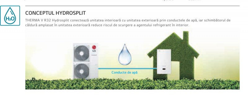 LG Therma V Hydrosplit este un concept inovator care ofera siguranta si care separa unitatea interioara (IDU) de unitatea exterioara (ODU), cele doua fiind racordate prin conducte de apa.