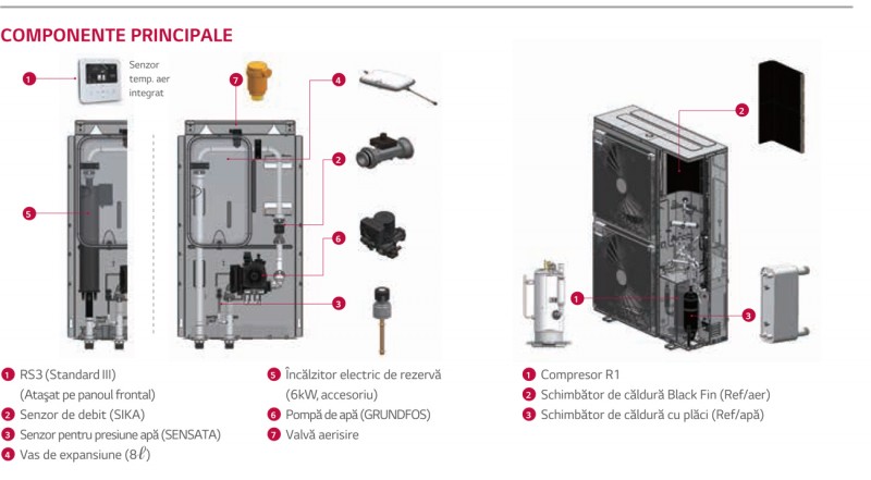 - Componente hidronice incluse in unitatea interioara: pompa de apa, vas de expansiune, aerisitor