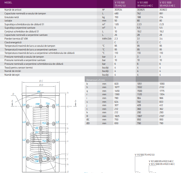 Puffer igienic cu o serpentina sanitara din inox si o serpentina agent termic Tesy V 12 S 1000 95 HYG5.5 C - 1000 litri - caracteristici tehnice