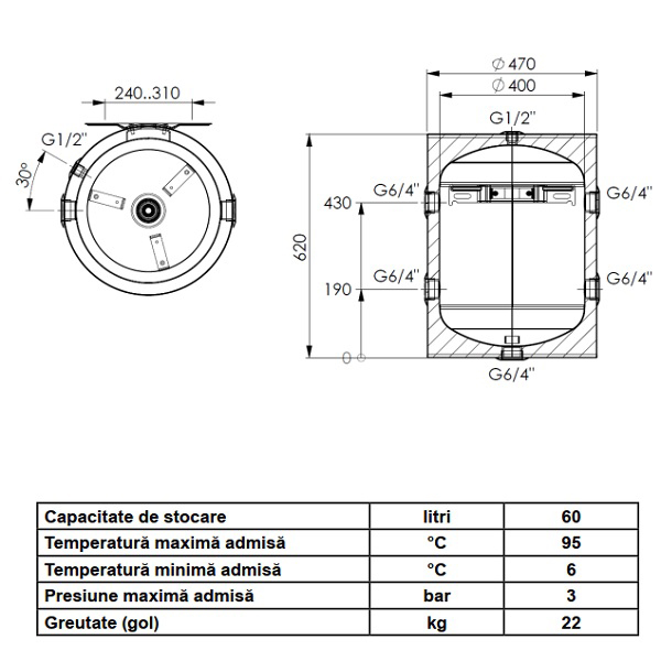 Presiunea maxima admisa de functionare a pufferului este de 3 bar (0,3 MPa).