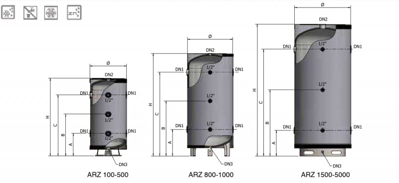 Rezervor izolat apa racita pentru instalare la exterior cu jacheta din aluminiu ELBI ARZ - dimensiuni