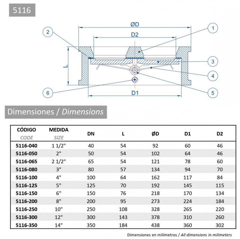 Robinet retinere dublu clapet fonta wafer MT Spain MT5116 - dimensiuni
