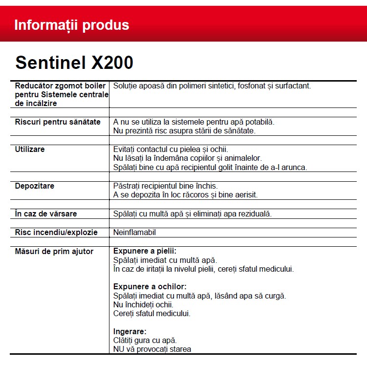 Sentinel X200 – Tratament non acid durabil pentru eliminarea zgomotului din centrala; distruge calcarul din schimbatoarele de caldura; este adecvat pentru toate metalele, inclusiv aluminiul. Trebuie sa ramana in instalatie.