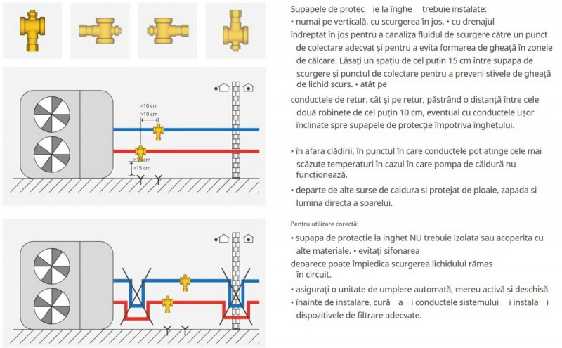 Supapele de protectie impotriva inghetului trebuie instalate numai pe verticala, cu scurgerea in jos si NU trebuie izolate sau acoperite cu alte materiale.