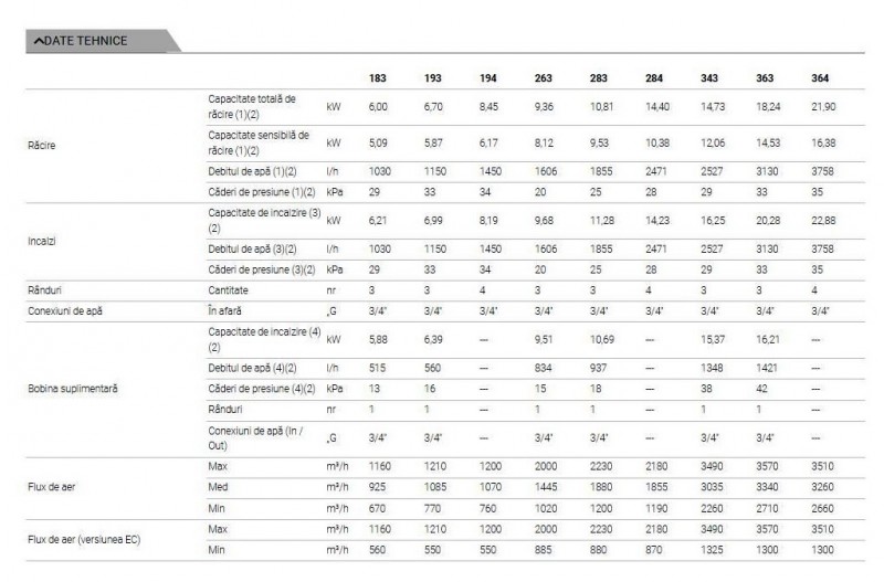 - Baterie schimbator de caldura din tevi de cupru si aripioare de aluminiu, racorduri de apa prevazute cu sistem anti-torsionare, aerisire manuala si supape de evacuare a apei.