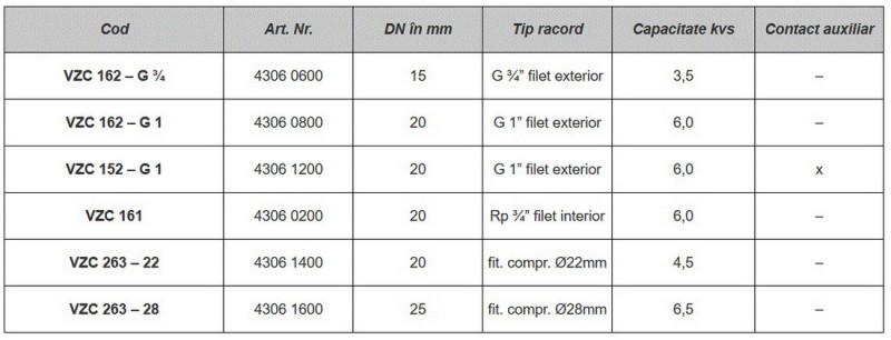 Ventilele VZC sunt fabricate din alama DZR si sunt capabile sa schimbe rapid directia de curgere între cele doua circuite. Comanda de comutare de pe portul A pe B este data de un echipament de control on/off (ex. termostat, comutator, etc.).