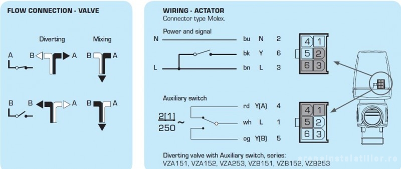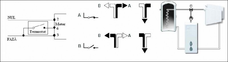 Portul permanent deschis este AB (în partea inferioara), sub actiunea servomotorului, ventilul comuta de pe portul A pe portul B si invers. Dotat cu microprocesor cu functie antigripare ce actioneaza automat motorul dupa fiecare saptamâna întreaga de stationare
