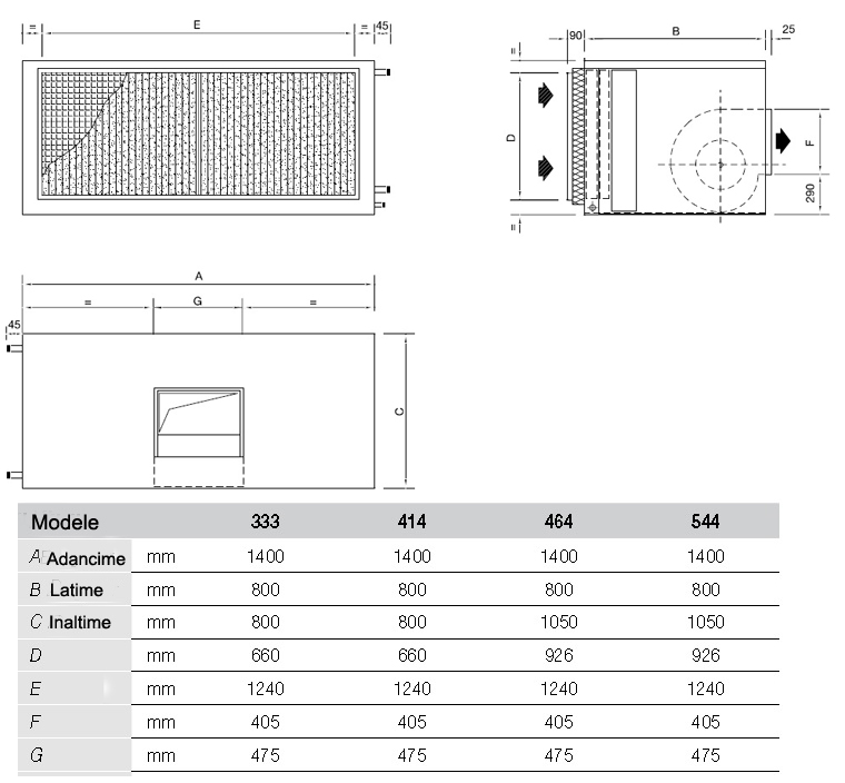 Dimensiuni Ventiloconvector de tubulatura cu disponibil mare de presiune CLINT UTW 464 - 38.1 kW racire, 91.8 kW incalzire