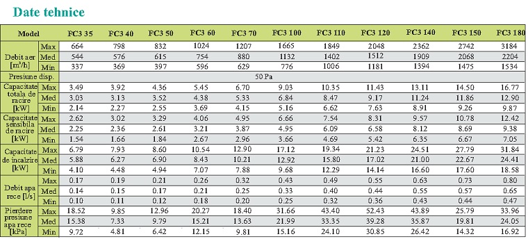 Debitele si capacitatile de racire / incalzire sunt declarate pentru disponibil de presiune 50 Pa.